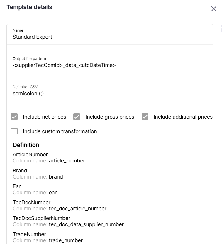When you have buyer organizations associated, you can find in TecCom Portal under Article Data - Export Options a list of existing templates for your buyer organizations.